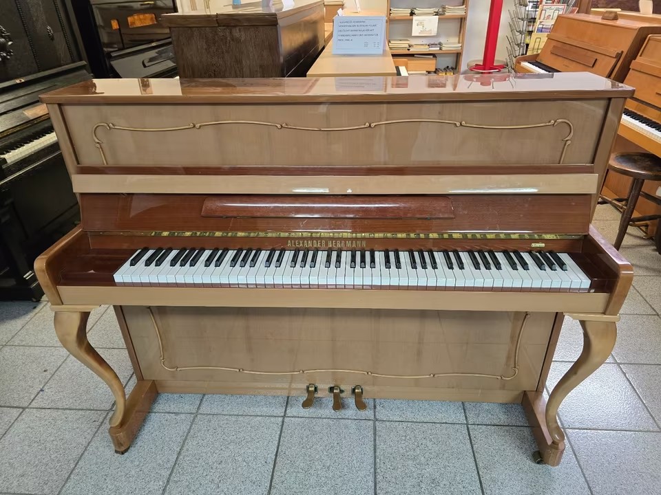 Klavier Alexander Herrmann Nussbaum mit Rennermechanik+ModeratorDeutsches Markenklavier der Firma Alexander Herrmann - Rennermechanik und Moderator. Farbe: Nussbaum poliert Höhe: 115 cm 3 Jahre Garantie in Deutschland Das Instrument steht anspielbereit bei uns in der Firma |